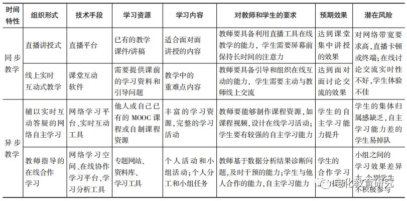 疫情防控期间,所有的教学活动都必须在线上完成,加之不同学龄段的学生的身心特点,以及不同类型课程自身的学科特点,如何组织在线教学成为当前一线教师面临的一大难题。为帮助教师结合学习者特征和教学内容的特征,选择合适的工具组织在线教学,我们按照网络教学中师生的交互方式和教学活动发生的时间特性,对网络教学组织形式进行了分类,并对每种在线教学组织形式的预期效果和潜在风险进行了分析(见表4)。