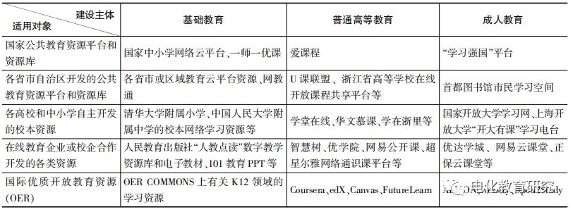 表 1 基于资源建设主体和适用对象的数字化学习资源分类列举