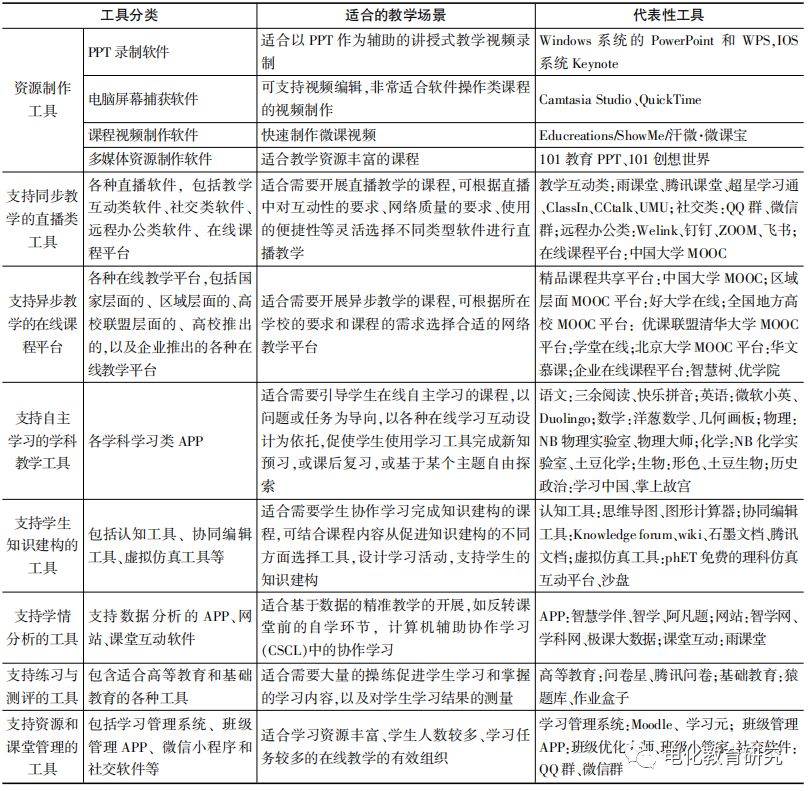 表2 支持在线教学过程各环节的学习工具分类、教学应用场景和代表性工具列举