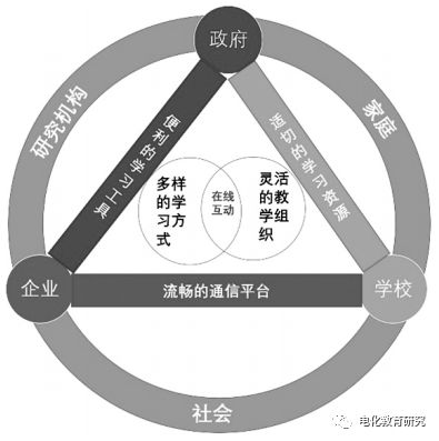 在线教育是一项复杂的系统工程,需要政府、学校、企业、家庭、研究机构、社会等多方的协同参与。据《第44次中国互联网络发展状况统计报告》显示,截至2019年6月,我国的在线教育用户占网民整体的27.2%,占手机网民的23.6%[2]。可见,在线教育的普及还任重道远。教育部科技发展中心主任李志民将在线教育面临的问题与挑战主要归结为以下四个方面:(1)高“辍学率”,在线学习效果不佳;(2)在线教育课程与用户实际需求脱节;(3)亟待建立有效的学习成果认证;(4)在线教育课程内容、师资和技术作为核心是行业发展的壁垒。要解决上述问题,需要政府、学校、企业、家庭、研究机构、社会等多方密切协同和通力合作,才能确保在线教育在内容质量、师资配备、技术支持,学习效果和学习成果认证等各环节形成良性循环。黄荣怀教授认为,密切的政企校协同体现如下特征:弹性教学,自主学习;按需选择,尊重差异;开放资源,科技支撑;政府主导,学校组织;家校联动,社会参与。