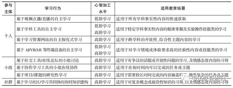 表 3 不同参与主体和心智加工水平维度下的学习方式分类列举