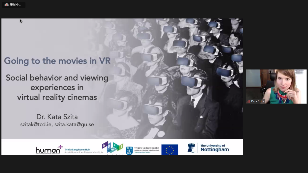 Kata Szita研究员带来题为“VR与电影:VR电影中的社会行为和观看体验”的讲座。Kata Szita首先解释了什么是社交式虚拟现实(Social VR),并对比了现实影院与虚拟影院带给观众的不同观感,进而深度讲解了一项虚拟观影实验,分享了观众社会行为、观影感受和健康状况的结论,最后给出社交虚拟现实未来研究领域的建议。