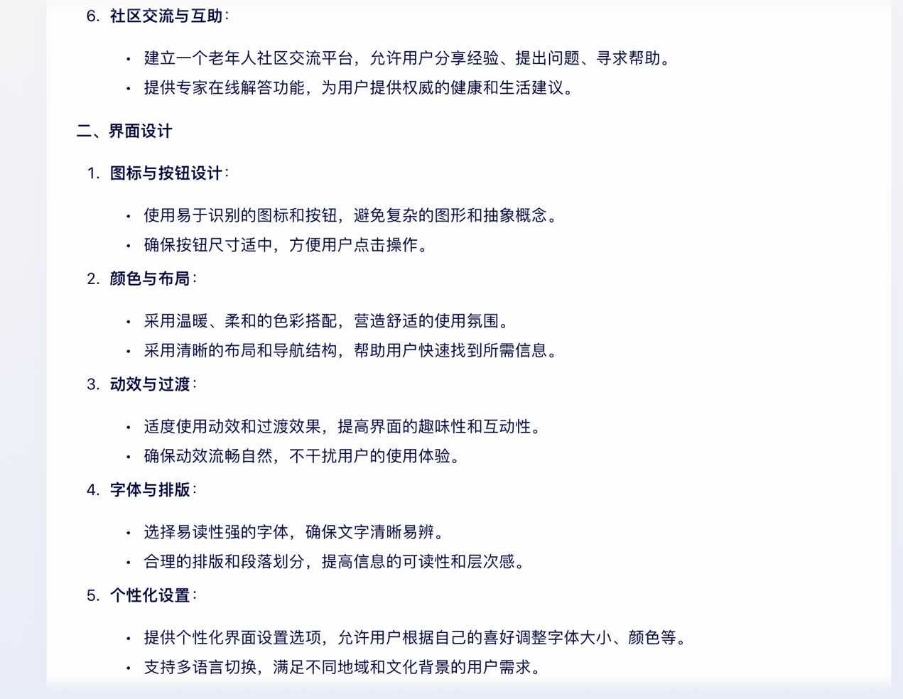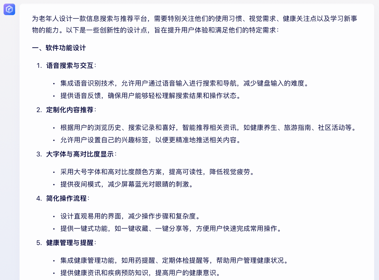 我要设计一款专门为老年人打造的信息搜索与推荐平台,让老年人能轻松访问与他们日常生活、健康和休闲相关的资讯。请从软件功能和界面设计的角度帮我想几个创新性的设计点,能够吸引用户,同时满足用户特征和需求。