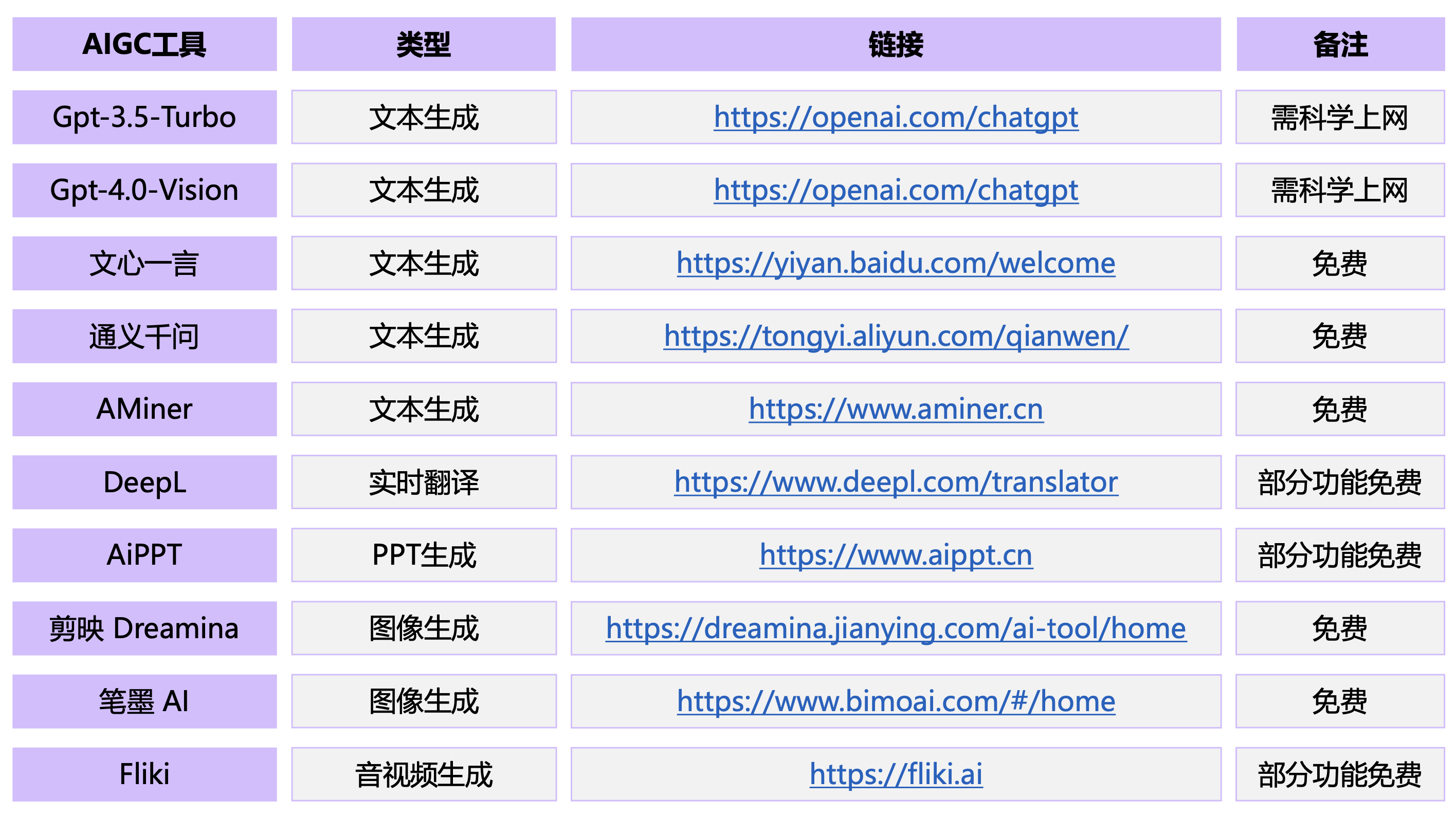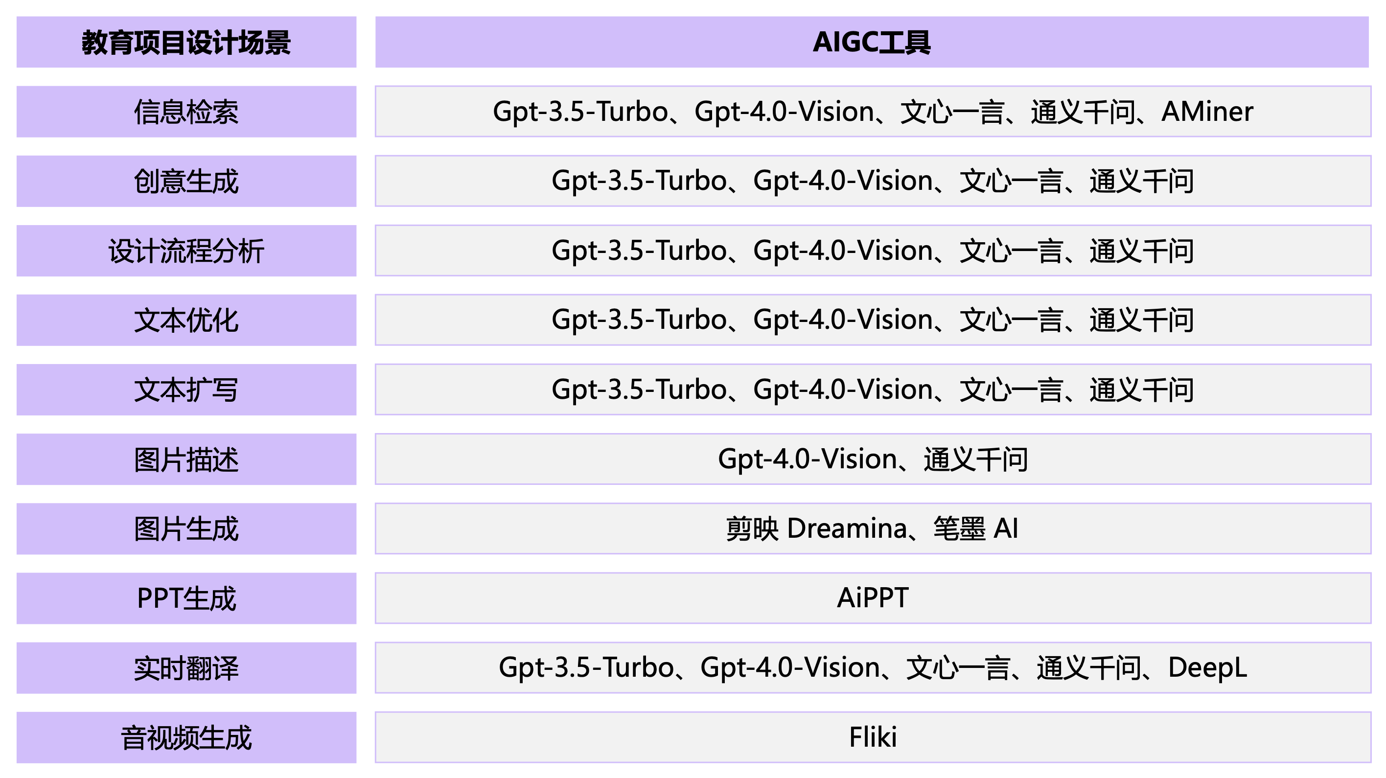 如何巧妙运用AIGC工具完成项目设计,让你的设计之旅事半功倍?大赛组委会基于AIGC支持的十大教育项目设计场景,推荐了一系列实用的AIGC工具。无论你是需要高效进行信息检索、激发创意灵感,还是想要优化设计流程、提升文本质量,甚至是实现图片描述、图片生成、PPT制作、实时翻译和视频生成,这些工具都能为你提供强大的支持。快来一起探索吧!