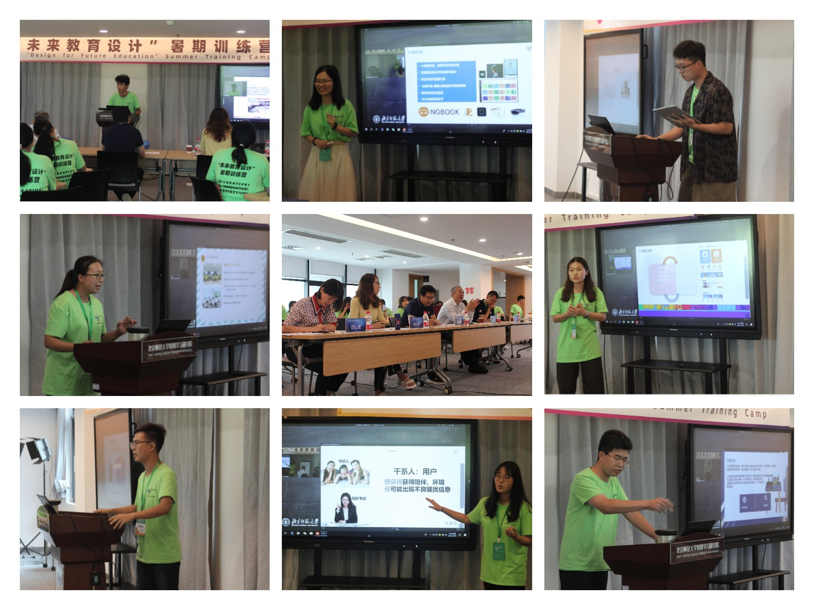 训练营的第四天,经过一上午的通力合作,学员们完成了最终的小组作品。各个小组针对不同的教育痛点,运用设计方法论进行了详细的分析,不断地修改完善作品,并结合前几天学习的表达技巧,采用PPT、视频或海报等形式进行了项目汇报,为充实的暑期训练营学术之旅画下了一个圆满的句号。
