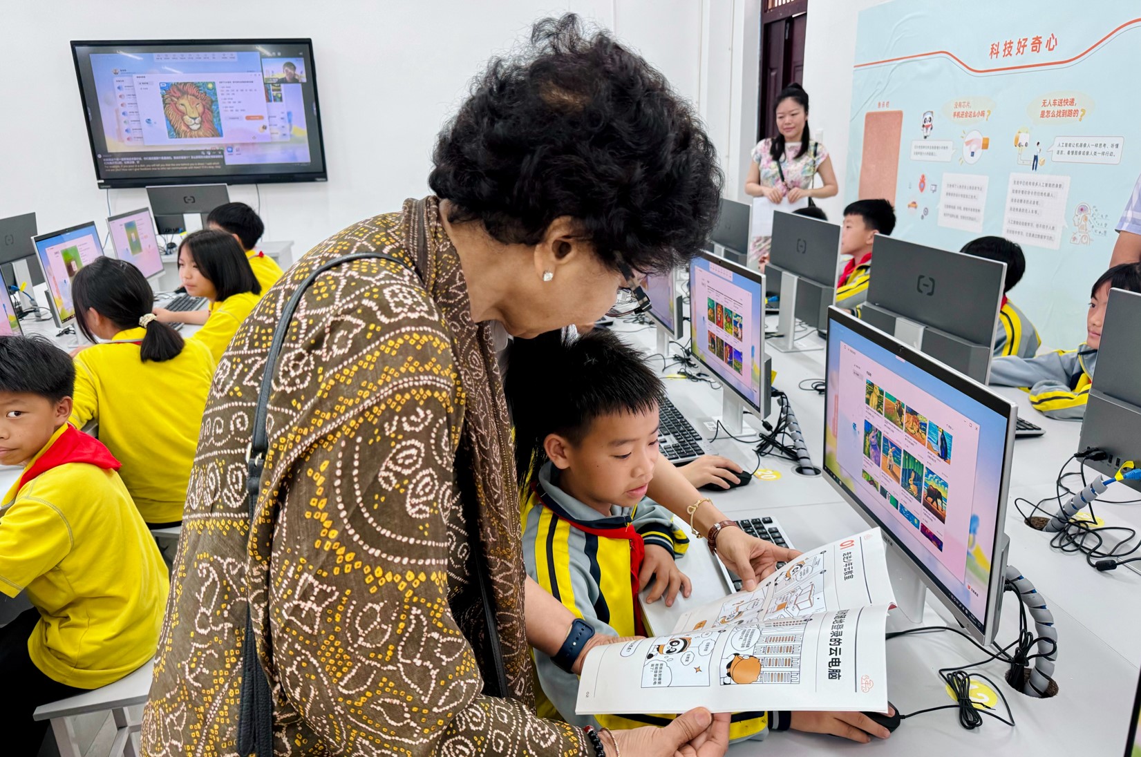 在大营希望小学、大营中学云机房,坎瓦尔教授一行观摩了通过云端课堂开展的AI艺术拓展课及建筑设计兴趣课。云端课堂通过引入科技志愿者和任课教师远程共建的方式,指导学生们运用储存在云端的智能工具,进行探究式学习与实践,让偏远山区的孩子享有与城市同龄人一样的教育资源,推动了教育公平。观摩过程中,坎瓦尔教授与学生们亲切交流,并寄语同学们,未来的科技世界由他们这一代来设计创造,她鼓励学生们要大胆想象,努力读书,不断提升数字素养,为数字时代的激烈竞争做好充分准备。
