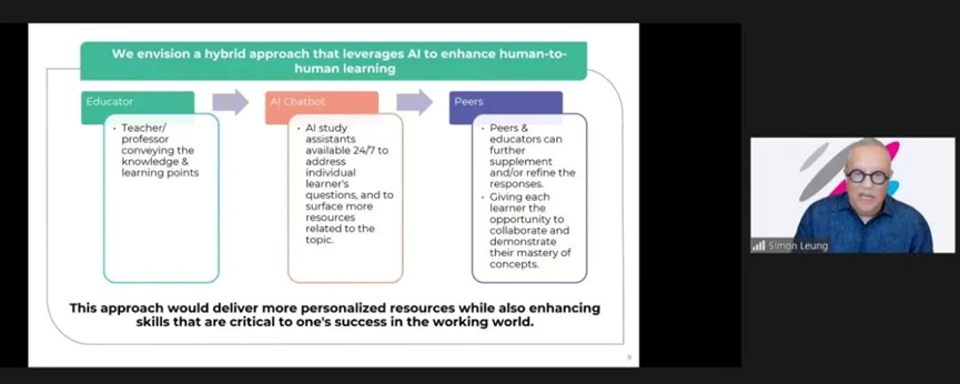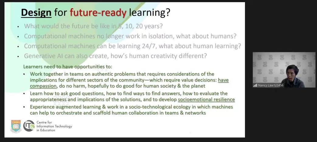 香港理工大学高等教育研究及发展研究院院长胡祥恩教授为听众带来两场不同主题的报告。在题为“Exploring the Horizon: AI in Advanced Learning Environments”的报告中,胡祥恩教授深入剖析了人工智能在教育领域的角色,强调使用者在得到大型语言模型给出的问题后,应继续对其答案进行质疑和提问。在题为“Socratic Playground for Learning”的报告中,他介绍了生成式人工智能在教育和学习环境中可能扮演的角色与应用,以及人工智能在教育中使用不当可能带来的危机。