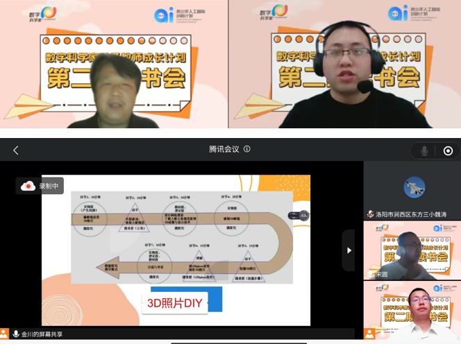 在《数字科学家》领读分享环节,由北京数字创客教育科技研究院金川老师带领老师们进行分享。浙江省温州市瓯海区外国语学校朱蕾老师从书籍导览、案例启发以及实践探索等角度分享了“校园里的大树有多高”,指出3D照片DIY的方式有利于学生进行科学的数码探究。太原师范学院的郝晋青老师分享了有关“血滴侦探”在动手与动脑等方面的应用,并希望通过总结与迭代使案例成为精品。宋圆老师同样分享了“3D照片DIY”的案例,指出A-STEM教育的研究对象是基于真实世界的问题,应当让学生进行充分的思考、设计、探究。深圳市承翰学校的杨三毛老师分享了《数字科学家》中的“探究式学习技能”,认为这些技能的运用有利于一线教师培养学生的探究能力。