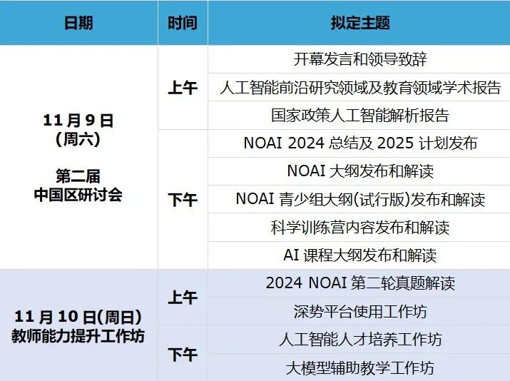 聚焦人工智能教育,用知识点亮未来的道路!第二届NOAI中国区研讨会暨教师能力提升工作坊,计划于2024年11月中旬在北京举办。