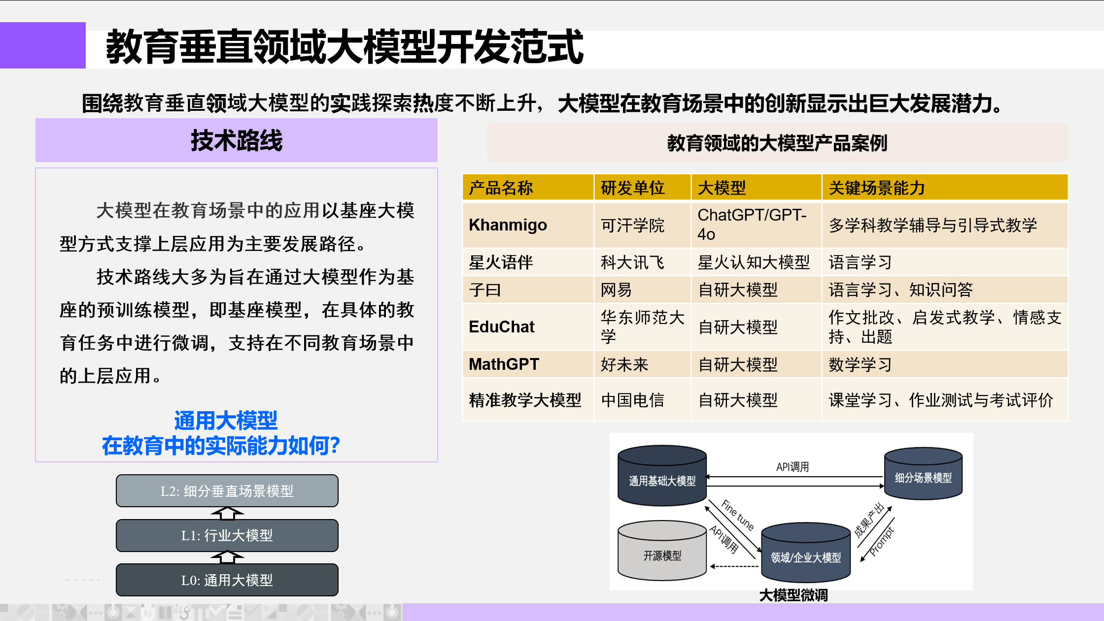 达婷老师分享的主题是:大模型与智能体的技术概述。通过技术层面,迅速让教师们了解大语言模型、智能体的概念、主流框架和设计模式。在此基础上达婷老师继续分享了如何提高基座大模型的性能,特别是教育垂直领域大模型的开发范式。