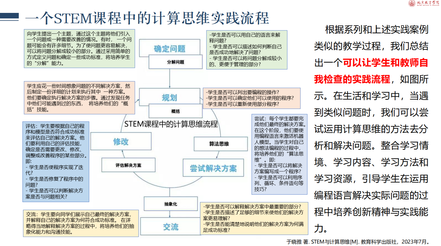 在STEM教育中,实践计算思维可以通过项目式学习、问题式学习等教学形式被推广和应用,从而促进学生计算思维的养成,并成功地将其应用到实际中。于老师还提出了一种可供STEM课程中的学生和教师自我检查的计算思维实践流程,对于计算思维的落地执行提供了一种可行且有效的实践手段。