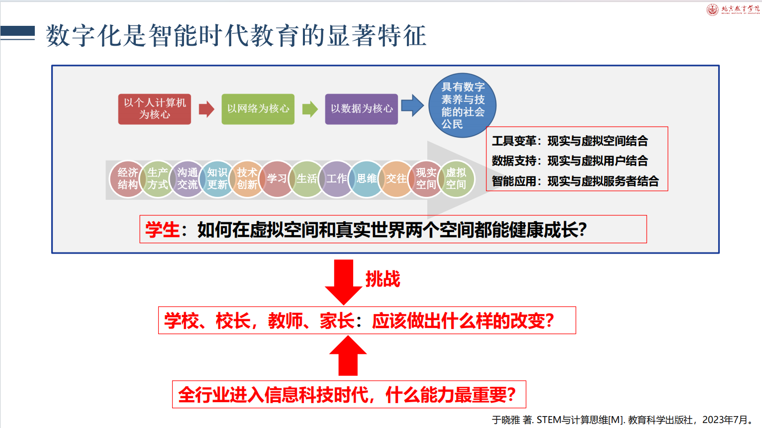 于晓雅老师首先详细解释了计算思维的概念及其在计算机科学中的重要性,并强调了培养计算思维对于培养新一代复合型人才的重要性。计算思维是一个问题解决过程,包括形式化阐述问题、逻辑组织与数据分析、通过模型与模拟等抽象方式进行数据表达、通过算法思维进行自动化求解、确认分析及实施可行解决方案等特征。而计算素养是指使用信息、信息处理代理、数字资产、网络组件、应用程序和系统的能力。因此,要培养学生成为未来的科学家、工程师和数学家,就必须懂得如何利用计算工具和方法来实现科学目标。