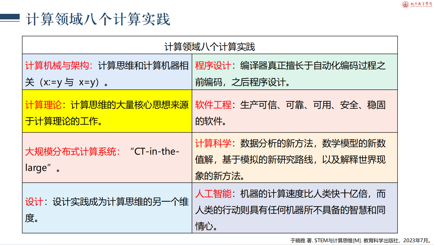 实践计算思维的过程就是将计算思维应用于构建计算世界的具体能力,涉及的技术包括使用诸如算法、人工智能、编译器等计算机科学的核心技术来寻找和实现解决问题的方案。于晓雅老师通过引入八大实践领域,揭示了计算思维在各个领域的广泛应用。