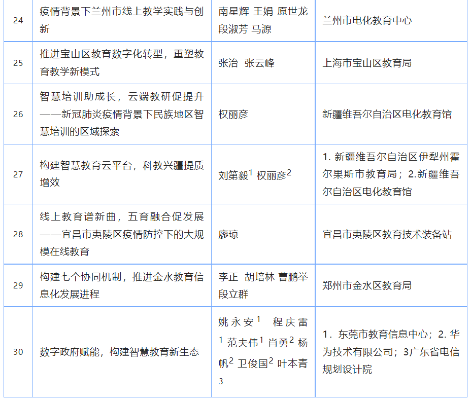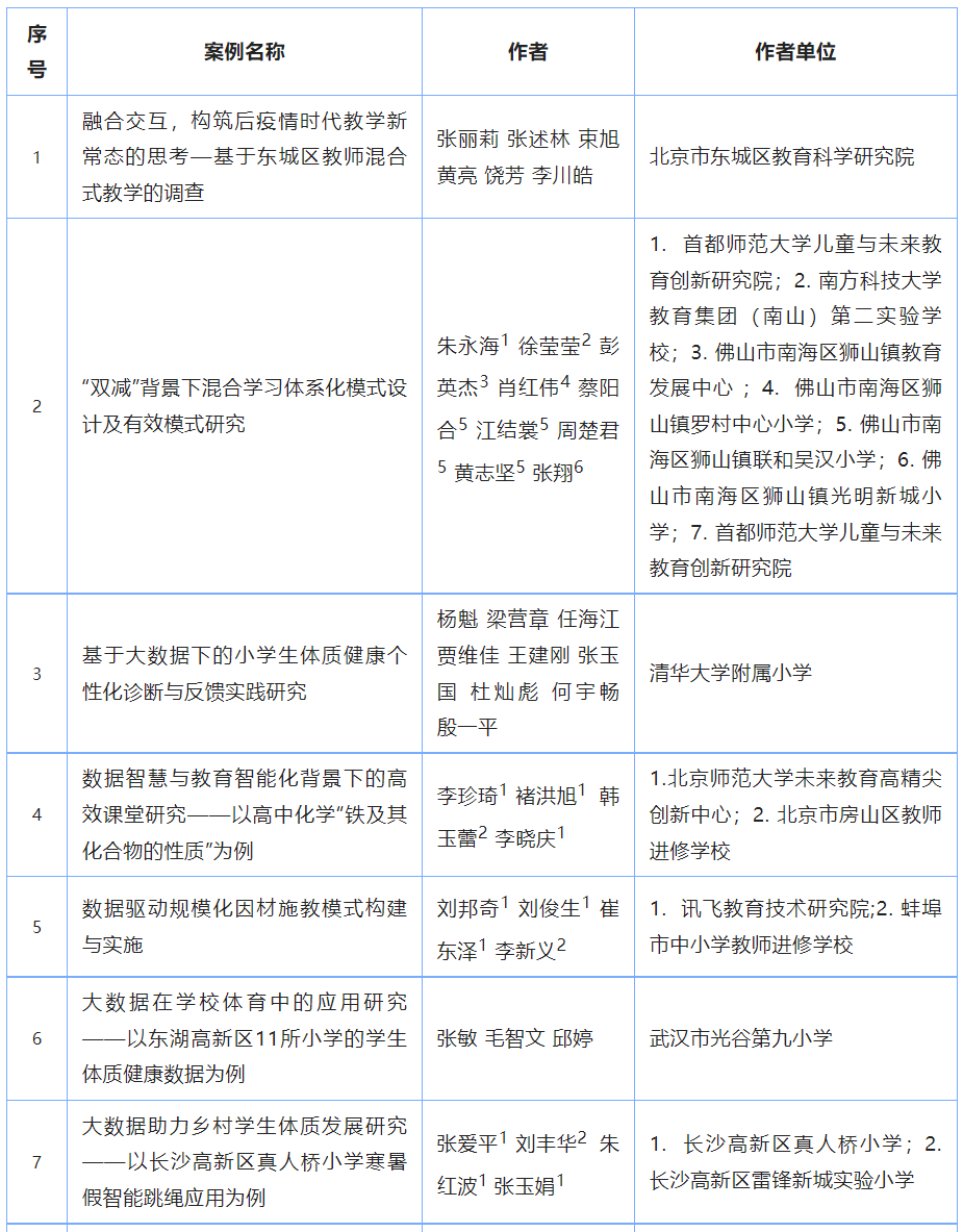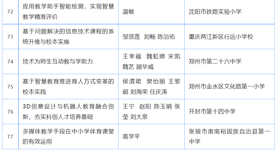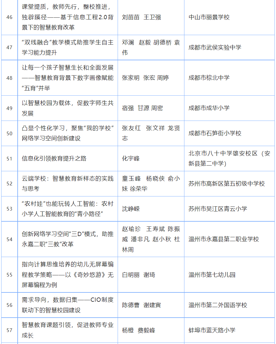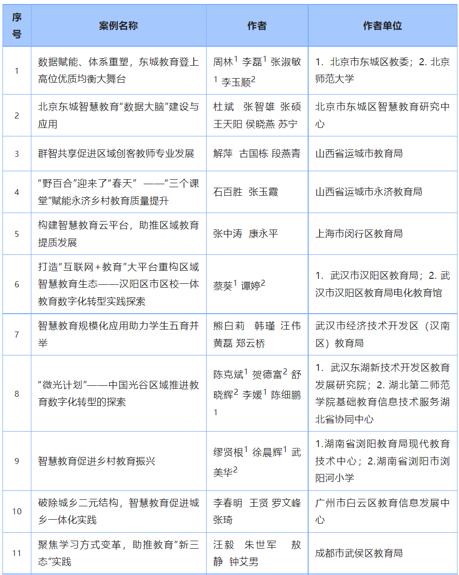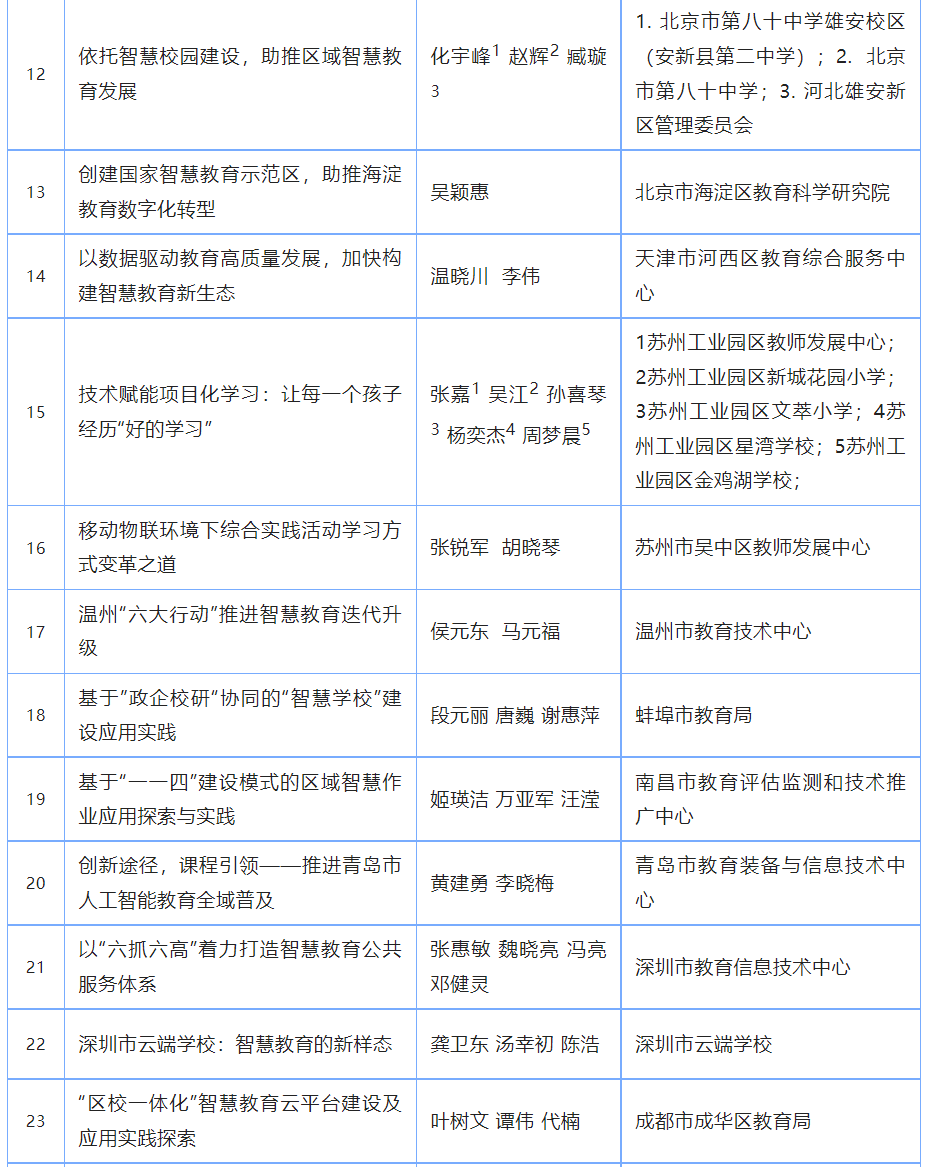 为了落实教育数字化战略行动,深入推进智慧教育发展,加强智慧教育优秀案例传播和经验分享,“智慧教育示范区”创建项目专家组秘书处与教育部教育信息化战略研究基地(北京、华中、西北)开展了智慧教育优秀案例征集活动,经过申报或推荐、案例撰写培训、修改、专家遴选等环节,拟确定123个智慧教育优秀案例,其中,区域建设类30个、学校实践类77个、解决方案类8个、研究成果类8个。现将名单予以公示。