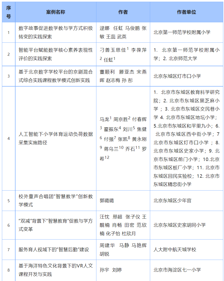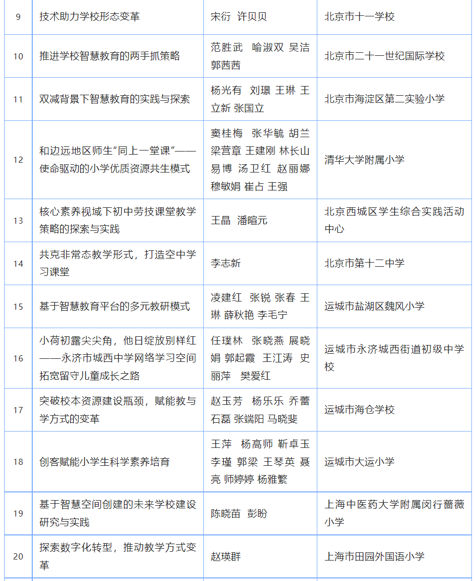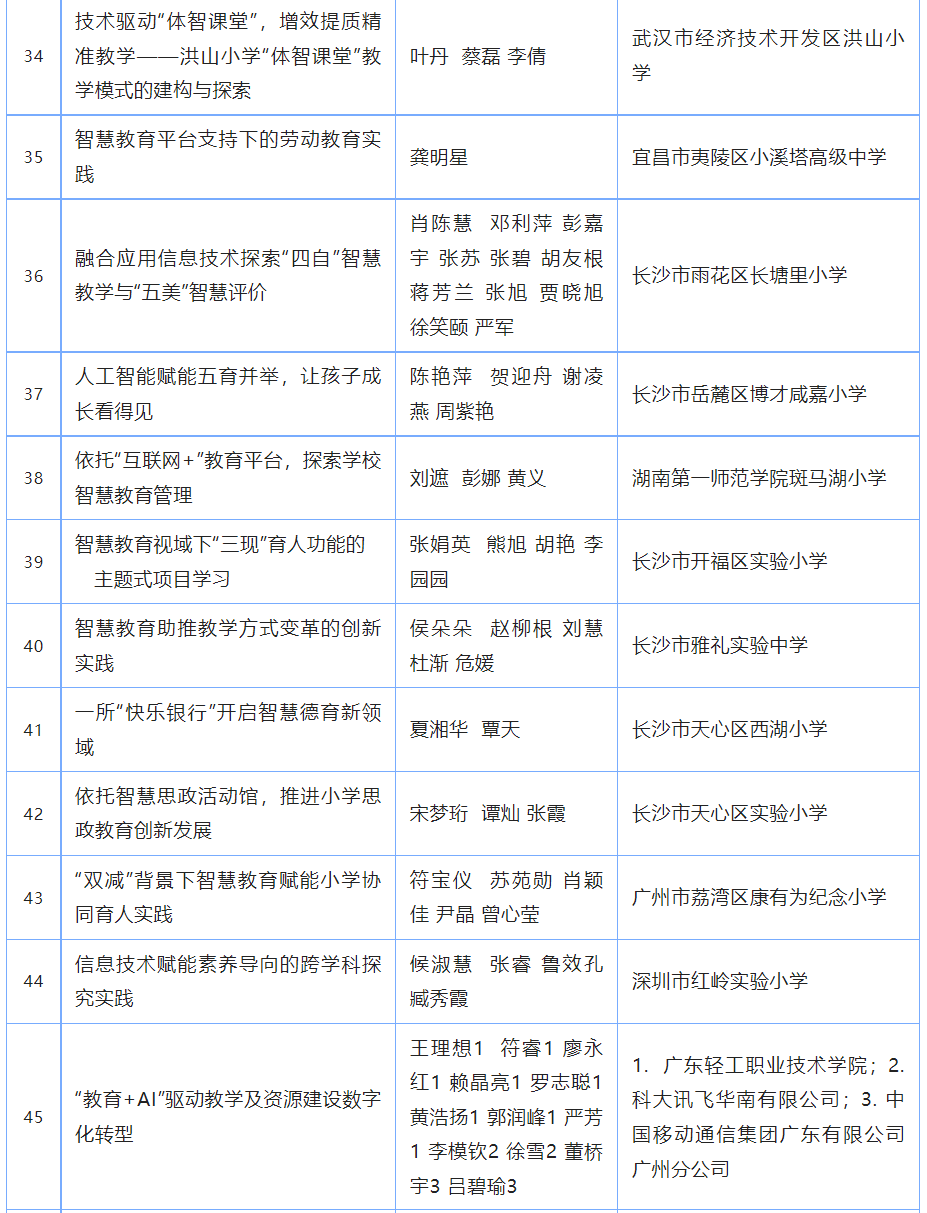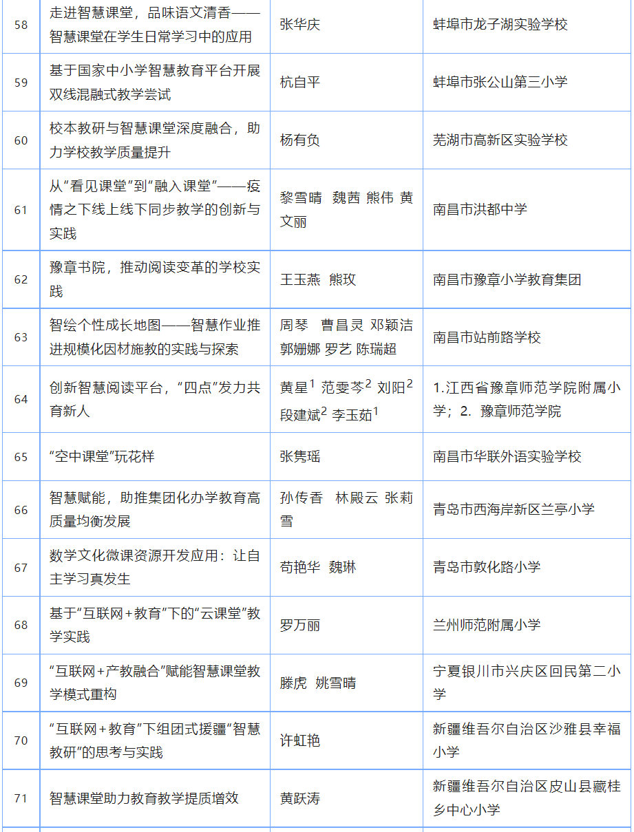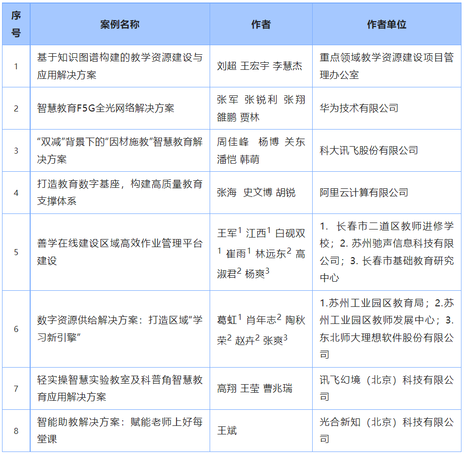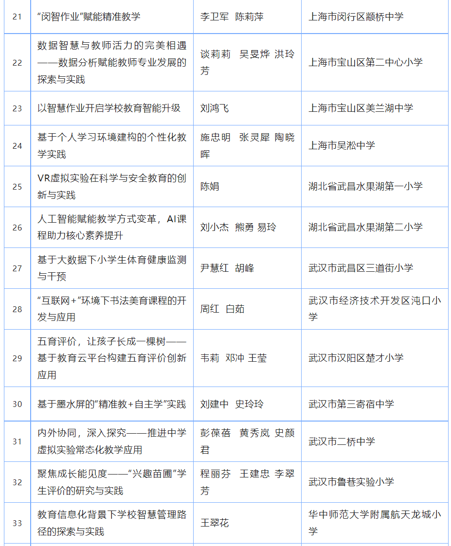 为了落实教育数字化战略行动,深入推进智慧教育发展,加强智慧教育优秀案例传播和经验分享,“智慧教育示范区”创建项目专家组秘书处与教育部教育信息化战略研究基地(北京、华中、西北)开展了智慧教育优秀案例征集活动,经过申报或推荐、案例撰写培训、修改、专家遴选等环节,拟确定123个智慧教育优秀案例,其中,区域建设类30个、学校实践类77个、解决方案类8个、研究成果类8个。现将名单予以公示。