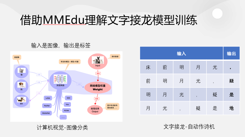 谢老师以李宏毅教授关于ChatGPT的解读为引,归纳了ChatGPT的技术原理。ChatGPT是内容生成(ALGC)的代表,其核心是经典语音序列的Transformer模型,并且引入了“自注意机制”,使用了人类反馈强化学习(RLHF)等模式。ChatGPT学习的四个阶段分别为:学习文字接龙、人类老师引导文字接龙方向、模仿人类老师的喜好、用增强式学习向模拟老师学习。谢老师讲解了借助MMEdu理解文字接龙模型训练的方法。