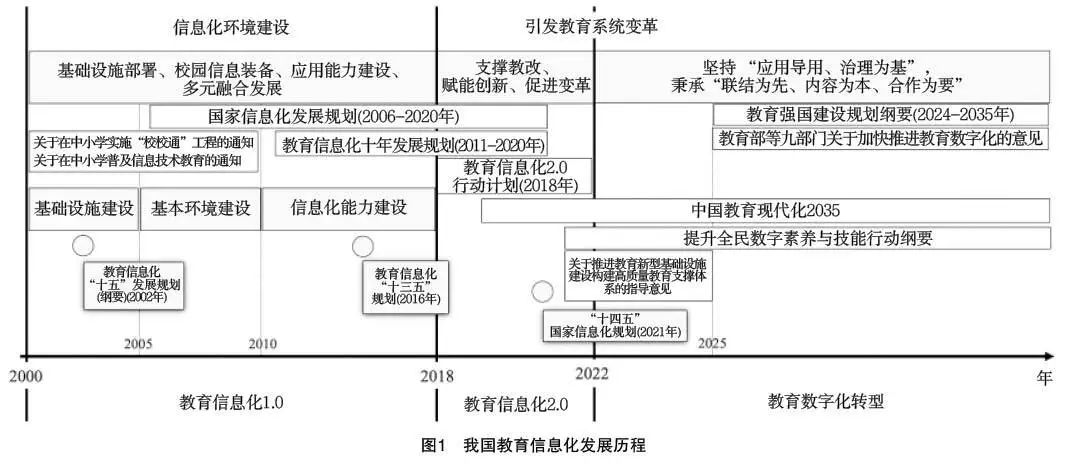 在我国教育数字化发展过程中,战略性顶层设计始终发挥着方向引领和系统统筹的核心作用。以教育数字化开辟发展新赛道、塑造发展新优势的战略定位,彰显出我国在新阶段以大格局、大视野谋发展、开新局的前瞻性判断。从历史进程来看,我国教育信息化的发展为当前教育数字化转型奠定了坚实基础(如图1所示)。在教育信息化1.0阶段以“教学环境变革”为主要特征,通过“校校通”“班班通”等重点工程,着力解决信息化基础设施“有没有”的问题,推动网络接入、设备配备和资源配置的基本普及,形成以基础设施部署、校园信息装备和初步应用能力建设为主的技术支撑体系,呈现出教育信息化的量变积累。在此基础上,进入教育信息化2.0阶段,国家以《教育信息化2.0行动计划》为战略抓手,推动信息技术与教育教学的深度融合,强调“好不好”的质量导向,突出融合创新、系统应用和能力提升,逐步实现从技术支撑向教育变革的跃迁。此阶段教育信息化逐渐由外延扩展转向内涵发展,为教育数字化积累了路径经验与模式探索。自2022年起,我国全面迈入教育数字化转型阶段。面对全球教育加速变革趋势,国家主动应变、抢占先机,以数字技术重构教育生态,推动教育治理方式、教学模式和学习方式的系统性变革,为有效应对新一轮科技革命和产业变革、加快建设教育强国提供有力支撑。