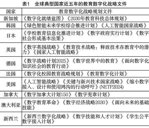 教育数字化进入国家决策体系与战略政策议程的根本动力之一,源于全球公共危机所打开的议程窗口。根据金登的多源流理论,政策变迁往往并非线性展开,而是在问题流、政策流以及政治流三者汇合的关键时刻被“聚焦事件”所触发与推动[9]。新冠肺炎疫情正是这样一个全球性的“聚焦事件”,它将教育系统暴露的结构性问题置于公共议程中。数字技术作为应急响应手段快速介入教育实践,在线平台与远程教学临时性地被用于支撑教学连续性,但也暴露出教育系统中基础设施短板、师生数字能力不足以及资源配置不均等深层问题。这一危机促使政策制定者意识到,教育数字化不应仅仅作为“技术方案”,而应成为重塑教育韧性、实现公平与质量并进的长期战略支点。在问题流充分显现的基础上,国际组织迅速推动政策方案的系统化建构。2021年教科文组织发布《一起重新构想我们的未来》报告,提出要批判性接纳数字技术,并强调将其嵌入新的社会契约框架中,服务于教育的公共性与包容性目标[10]。2022年,联合国教育变革峰会将“数字学习和转型”作为五大行动路径之一,提出技术应用必须成为教育系统性变革的组成部分,而非孤立手段[11]。在国际社会趋同的理念牵引下,各国政府纷纷响应,将教育数字化从阶段性的替代方案升级为国家战略的核心内容,如表1所示。世界典型国家的教育数字化战略不仅展现出教育数字化由应急机制走向制度嵌入的趋势,更表明数字技术已成为各国重新设计教育系统架构与治理模式的关键变量。