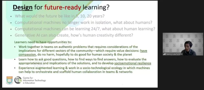 香港大学教育学院副院长Nancy Law作题为《Current conceptions of on-demand learning cannot meet future education needs》的特邀报告。她首先表达了对按需学习的理解,提出学习需要目标和路径的规划。其次,她讨论了为面向未来的学习而设计的重要性,强调学习者应有机会在团队中解决实际问题,培养社会情感弹性,以及在社会与技术交互的生态体系中体验虚实结合的学习和工作方式。最后,她提出了几点面向未来的学习的发展建议,包括建立明确的学习目标、有效的评价标准、关键的支持服务和合理的学习设计。