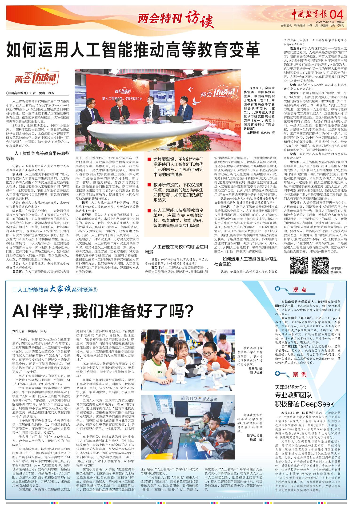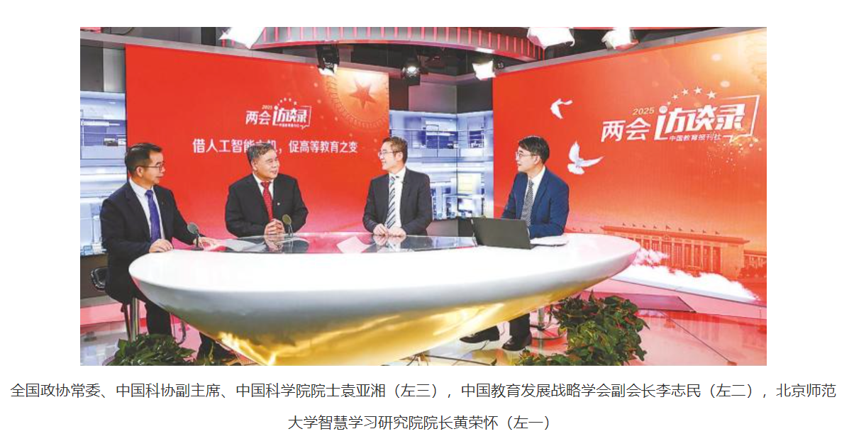 3月3日,全国政协常委、中国科协副主席、中国科学院院士袁亚湘,中国教育发展战略学会副会长李志民,北京师范大学智慧学习研究院院长黄荣怀,做客中国教育报刊社“两会访谈录”,一同探讨如何借人工智能之机,促高等教育之变。