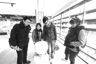 2017年12月15日,读者在新华书店杭州庆春路购书中心与人工智能机器人“小新”进行互动