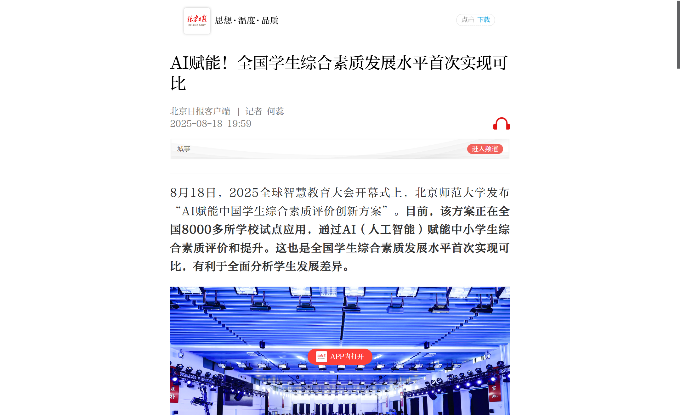 8月18日,2025全球智慧教育大会开幕式上,北京师范大学发布“AI赋能中国学生综合素质评价创新方案”。目前,该方案正在全国8000多所学校试点应用,通过AI(人工智能)赋能中小学生综合素质评价和提升。这也是全国学生综合素质发展水平首次实现可比,有利于全面分析学生发展差异。