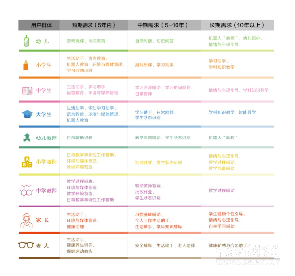 然后曾海军表示,在市场和产品分析的基础上,白皮书通过问卷调查,获取了7类视角下9类人群对教育机器人的需求,汇总需求内容233项,结合文献调研,以人机交互技术、机器人视觉技术、情境感知技术在内的3个关键技术的成熟度作为需求时程定义准则,总结出了各个群体的典型需求与实现时程。