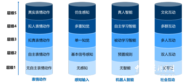 接着他介绍了“表情动作”“感知输入”“机器人智能”“社会互动”4个维度和按照功能由弱到强5个层级的产品分析框架。