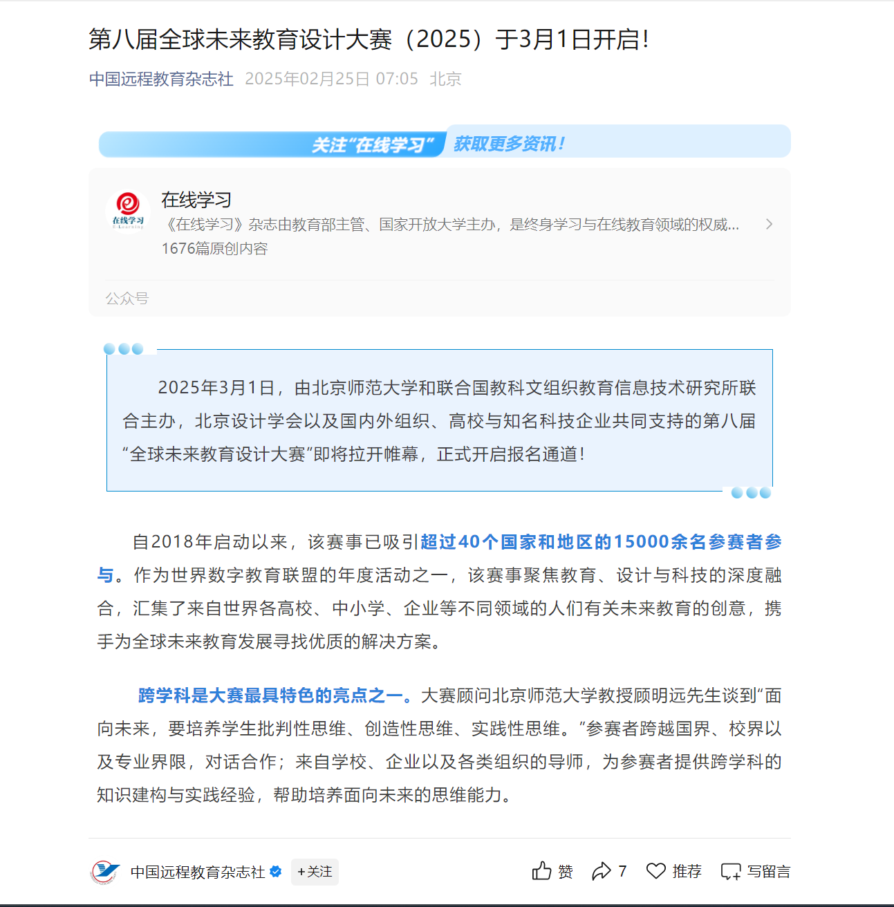 2025年3月1日,由北京师范大学和联合国教科文组织教育信息技术研究所联合主办,北京设计学会以及国内外组织、高校与知名科技企业共同支持的第八届“全球未来教育设计大赛”即将拉开帷幕,正式开启报名通道!