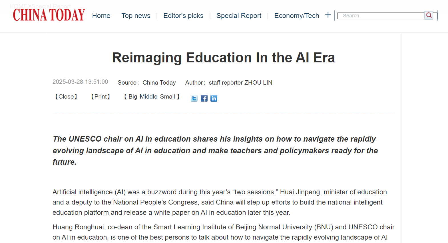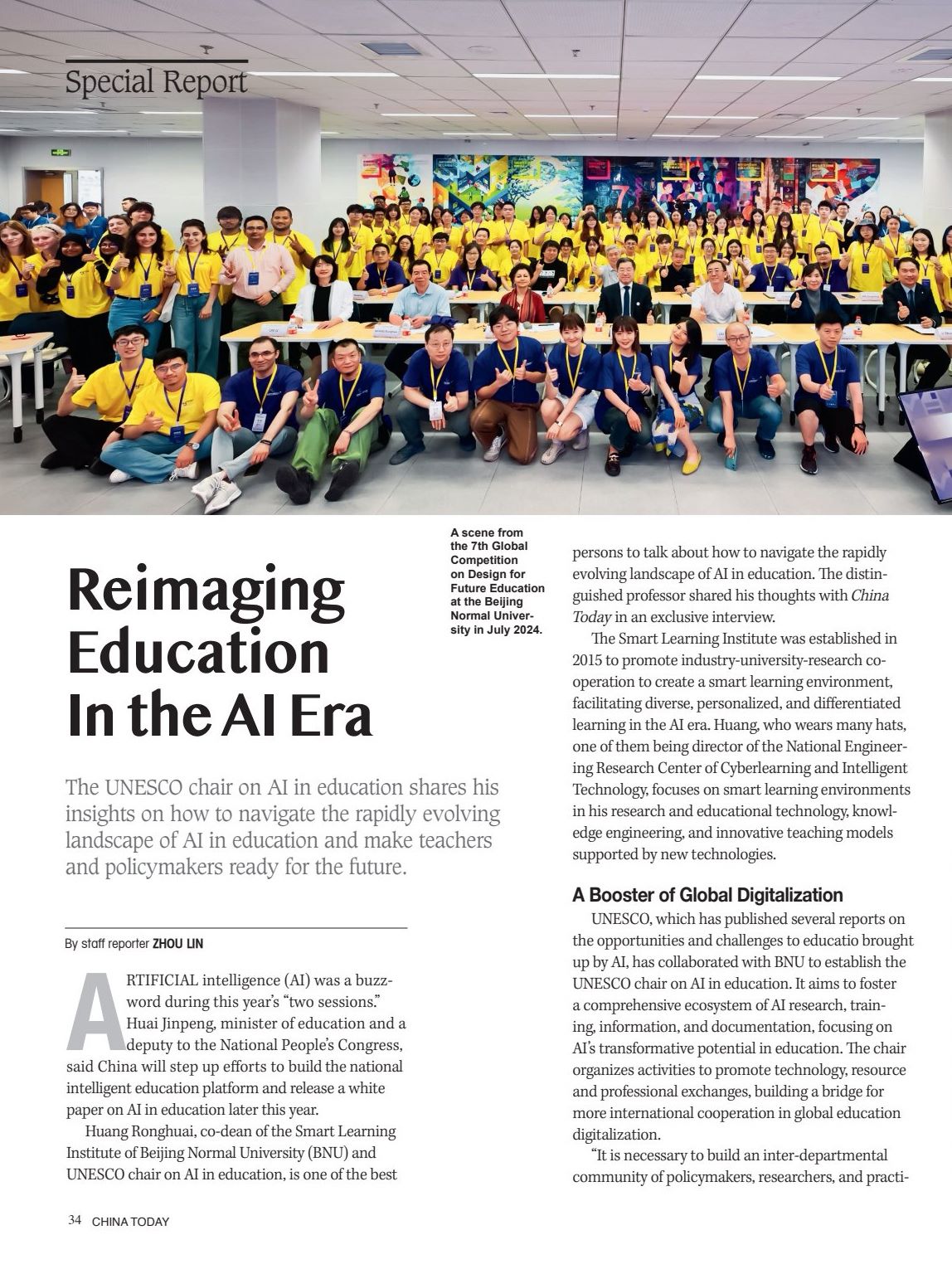 Huang Ronghuai, co-dean of the Smart Learning Institute of Beijing Normal University (BNU) and UNESCO chair on AI in education, is one of the best persons to talk about how to navigate the rapidly evolving landscape of AI in education. The distinguished professor shared his thoughts with China Today in an exclusive interview.