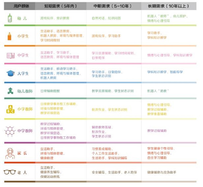 各类用户群体教育机器人需求与实现时长