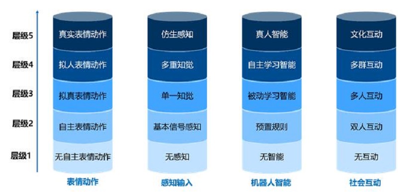 白皮书还提出了“表情动作”“感知输入”“机器人智能”“社会互动”4个维度和按照功能由弱到强5个层级的产品分析框架。