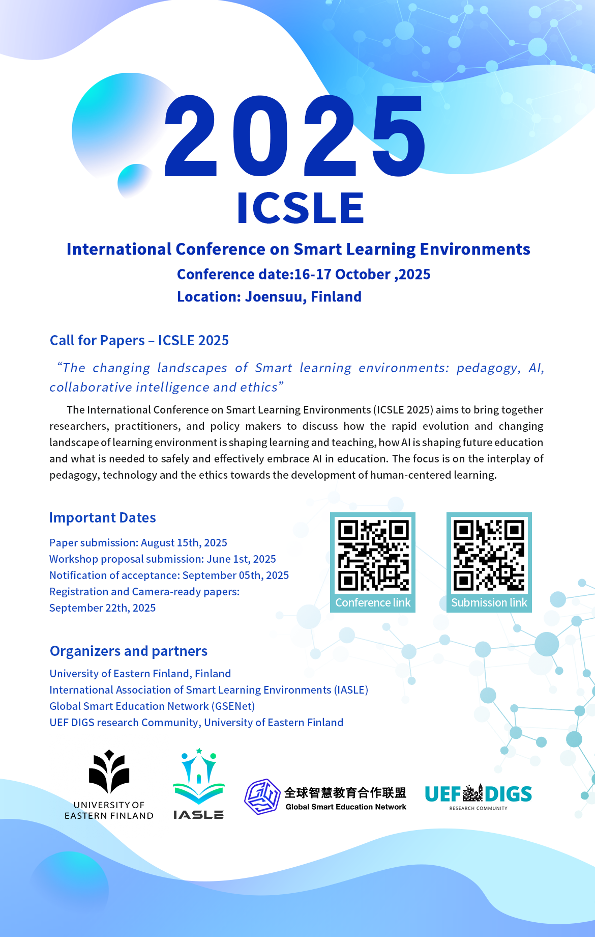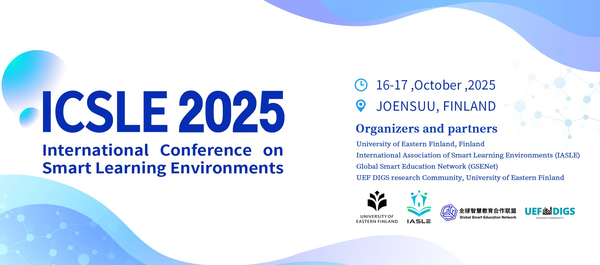 第九届国际智慧学习环境大会(ICSLE 2025)将于2025年10月16日至17日在芬兰约恩苏举行。会议由国际智慧学习环境协会(IASLE)与东芬兰大学(University of Eastern Finland)主办,采用线下和线上融合的方式召开。