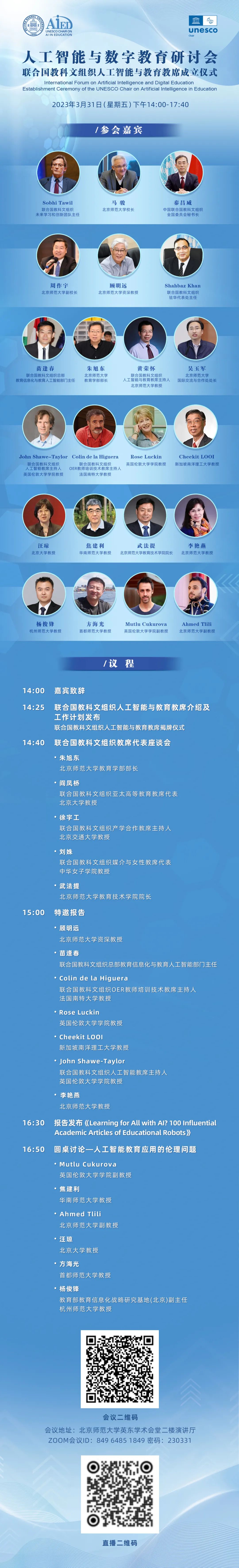 在教席成立之际,研讨会围绕人工智能与数字教育,探讨智能技术的有效应用模式,明确其在教育数字化转型中的作用,以及其中的伦理相关问题,旨在帮助主要利益相关者了解人工智能技术的最新进展和发展趋势,通过分享经验、专业知识和资源,审视使用AI变革教育的实践,形成共识,从而找出有效和创新的解决方案。主题包括: