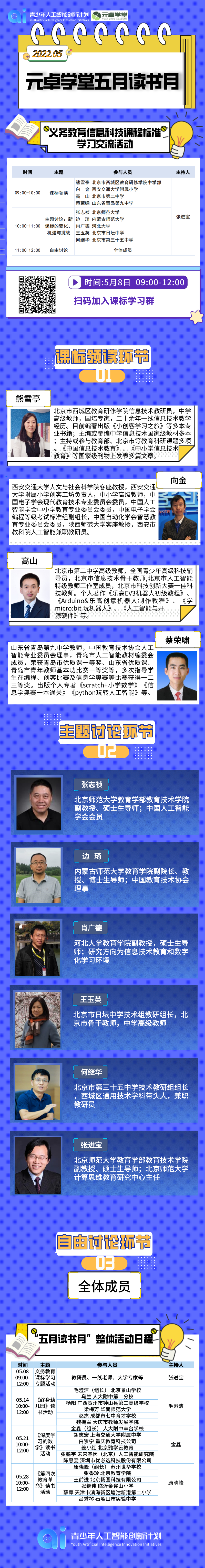 “五月读书月”首期(5月8日,周日)将围绕近期新发布的《义务教育信息科技课程标准(2022版)》开展学习交流活动。通过新课标学习活动,帮助信息科技老师熟悉课标,更好地开展教学工作。