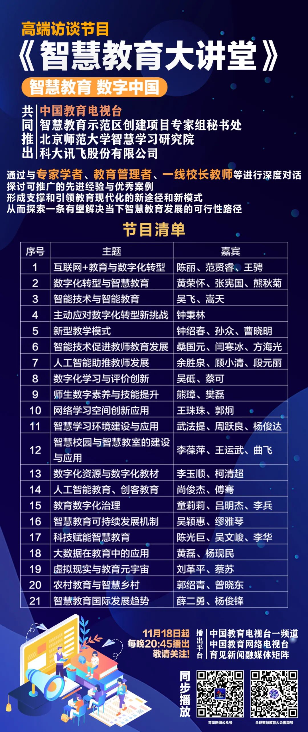 11月18日起,每晚20:45,在中国教育电视台一频道,以及中国教育网络电视台、育见新闻融媒体矩阵、全球智慧教育大会视频号播出,敬请关注!