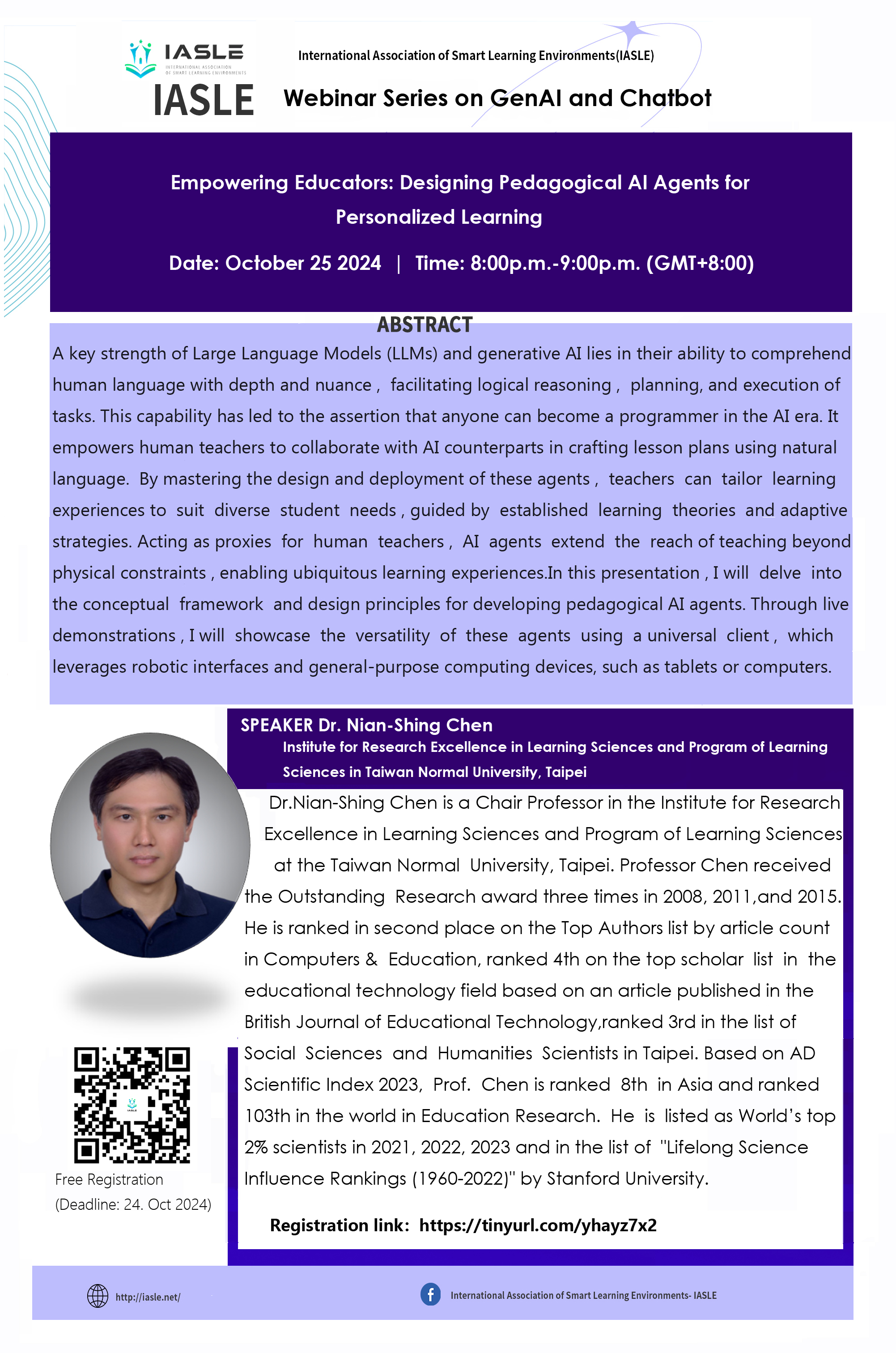 国际智慧学习环境协会(IASLE, http://iasle.net/)于2024年举办“生成式人工智能和聊天机器人”系列网络研讨会,探讨生成式人工智能和聊天机器人领域的多样视角、实践应用、指导原则以及宝贵经验,将在10至12月举办三场不同话题的网络研讨会,期待您的参与。