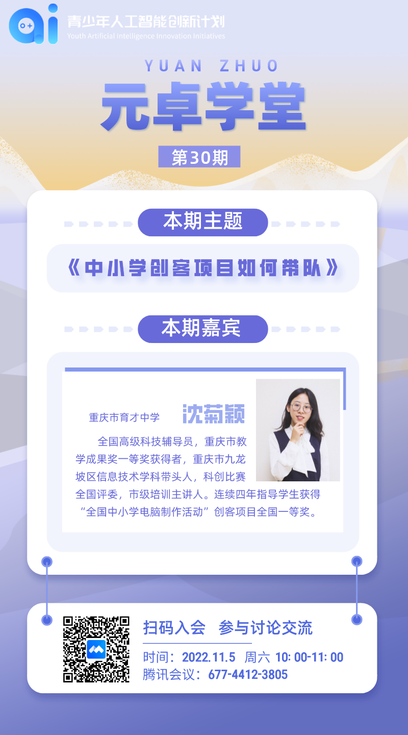 本周六(11月5日),元卓学堂邀请重庆育才中学沈菊颖老师,围绕《中小学创客项目如何带队》分享自己的经验与思考,期待各位老师参与谈论交流。