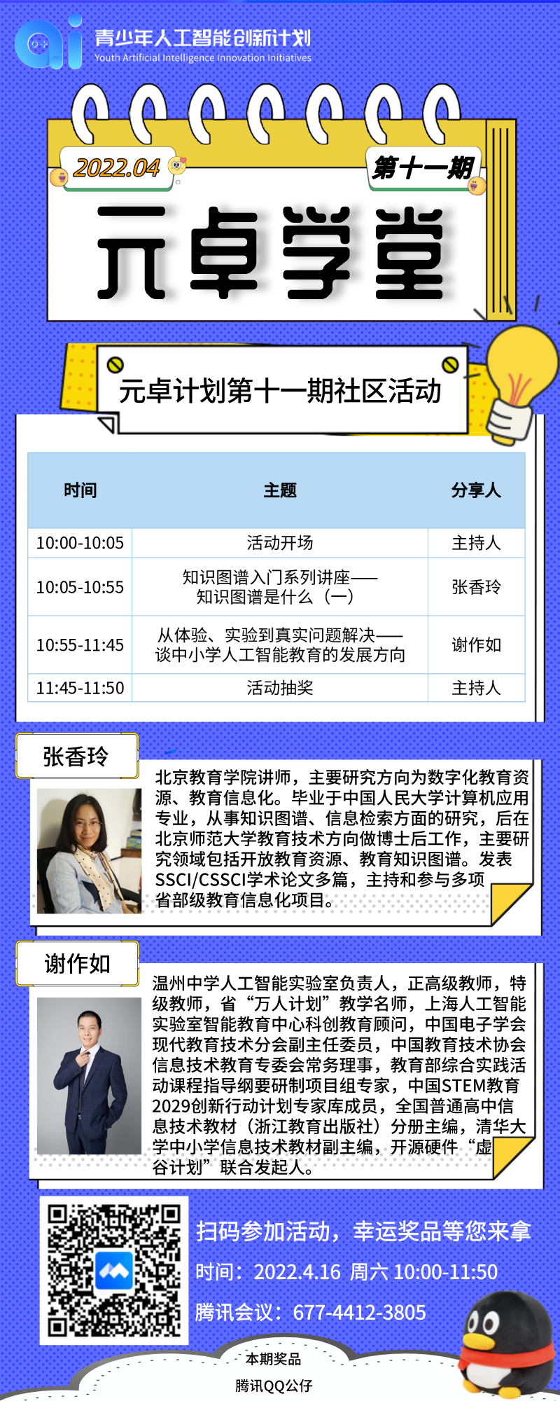 元卓计划持续开展“元卓学堂”系列活动(每周六 10:00-11:50 腾讯会议:677-4412-3805),旨在为人工智能感兴趣的老师提供一个互相交流和学习的平台。