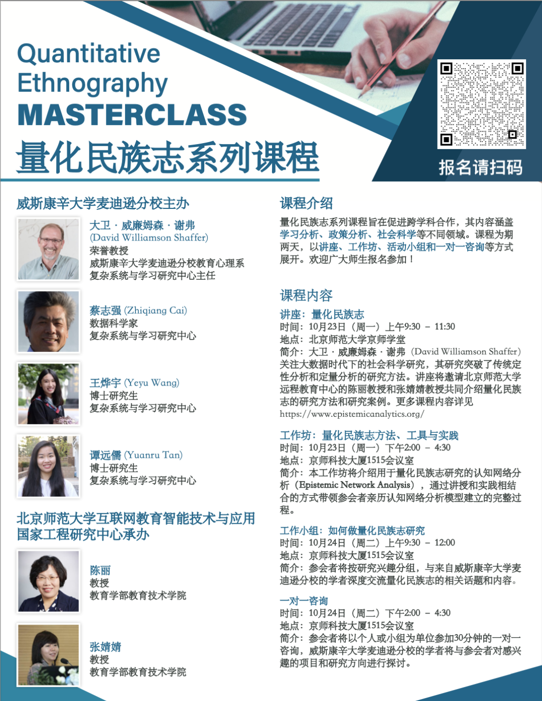The Quantitative Ethnography Masterclass Series is designed to help researchers in learning analytics, policy analysis, and the social sciences more generally learn about quantitative ethnography. This Masterclass is in the form of lectures, workshops, hands-on work groups, and one-on-one consulting, which is open to graduate students, postgraduate scholars, and faculty members.