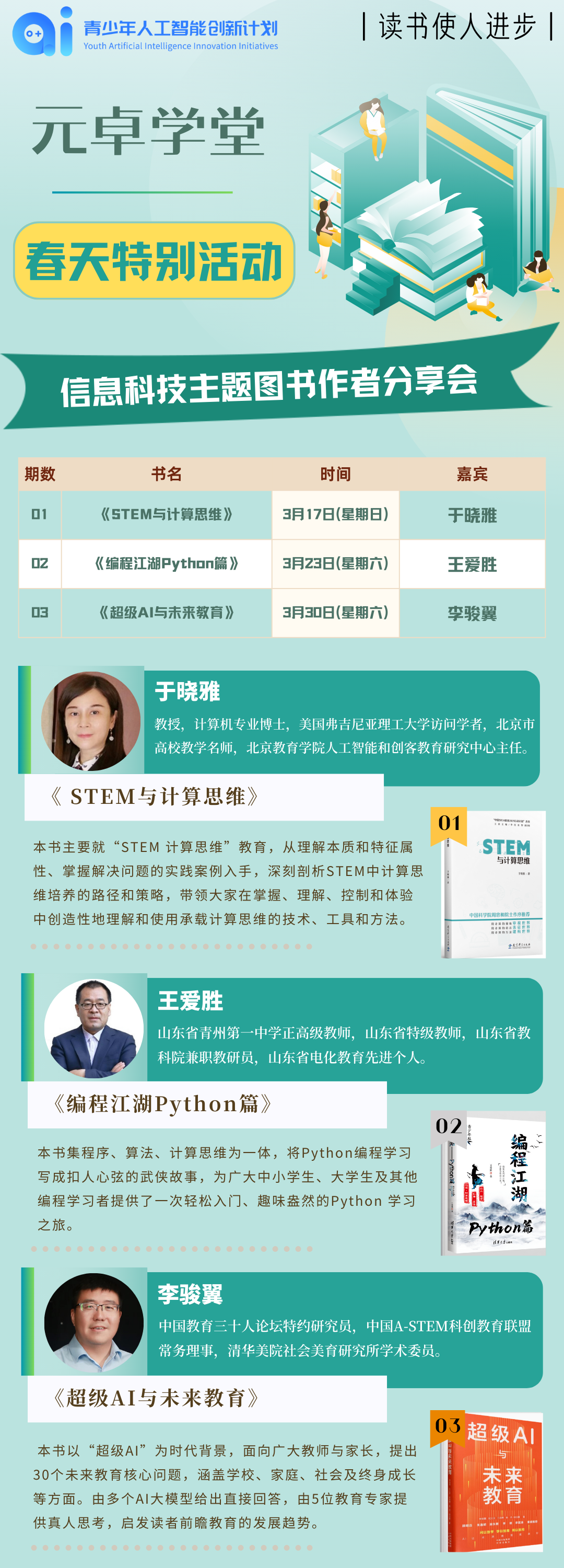 2024年3月,北京师范大学元卓计划将开展春天特别活动:信息科技主题图书作者分享会。本次活动特别邀请了三位图书作者,旨在透过作者的视角,与参会老师进行思想交流与碰撞。