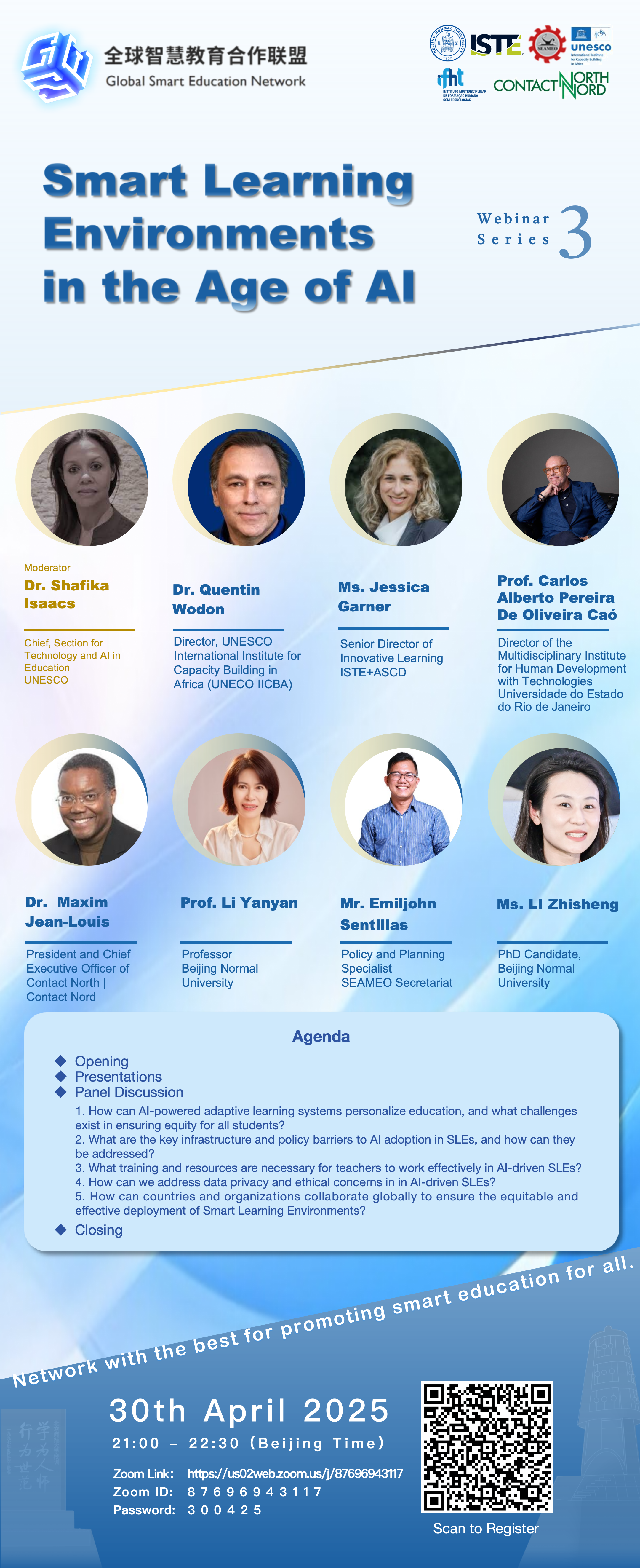 全球视野下的智慧教育系列研讨会第3期,将聚焦“人工智能时代的智慧学习环境”,邀请全球专家学者,关注基础设施建设、教师能力提升及学习者参与度等关键话题。共同剖析潜在机遇与风险挑战,分享实践案例,探寻解决方案。