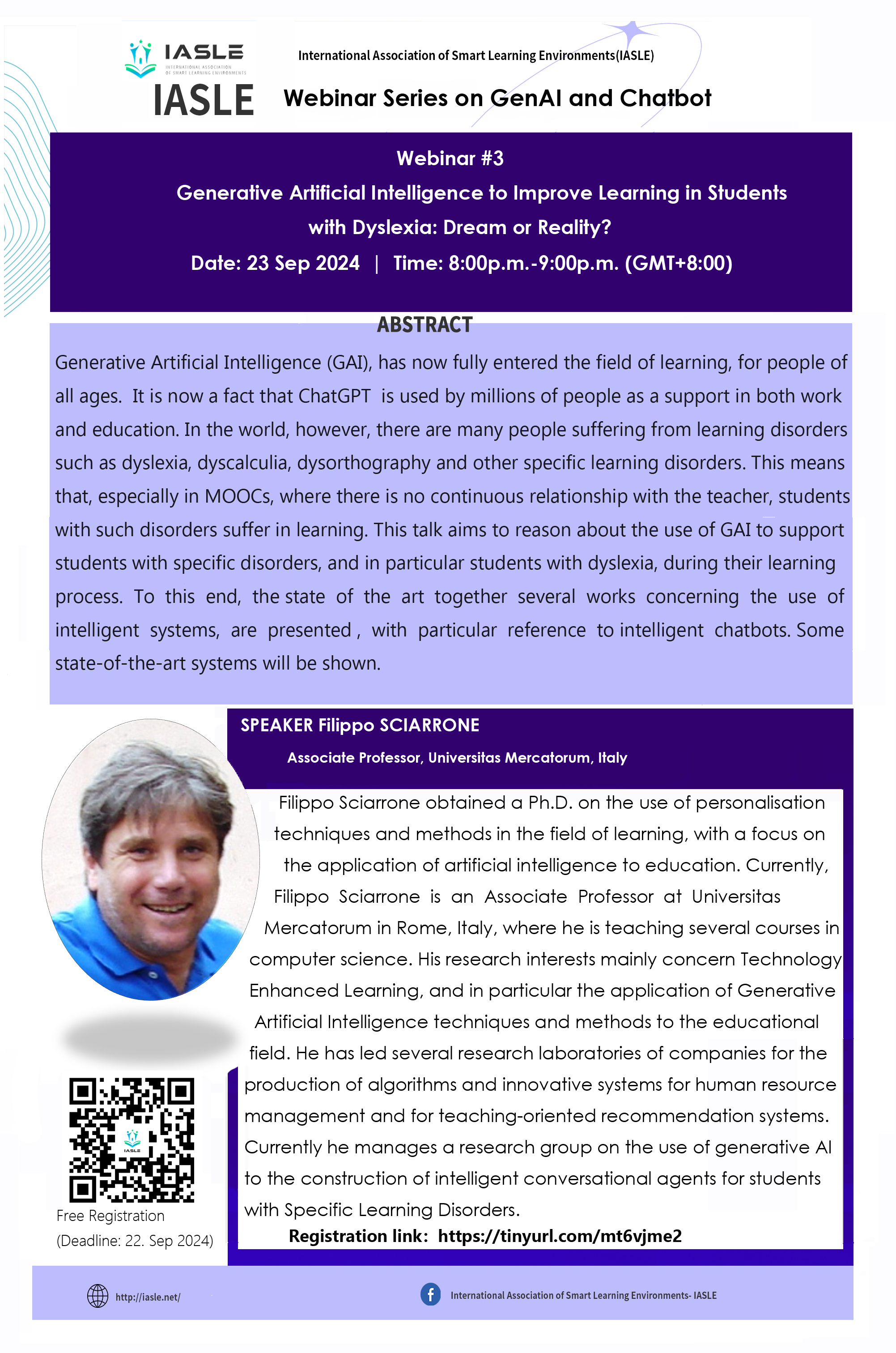 生成式人工智能(Generative Artificial Intelligence, GAI)现已深入学习领域,为各年龄段的学习者提供支持。当前,ChatGPT已被数百万人用作工作和教育的支持。尽管如此,全球仍有许多人受到学习障碍的影响,包括阅读障碍、计算障碍、书写障碍及其他特殊学习障碍。这意味着,患有此类障碍的学生在学习中受到影响,尤其是在缺乏与教师持续互动的慕课中。本次讲座旨在探讨如何利用生成式人工智能为有阅读障碍的学生提供学习过程中的支持。为此,讲座将介绍关于智能系统使用的最新成果,特别是智能聊天机器人,并展示一些最先进的系统。