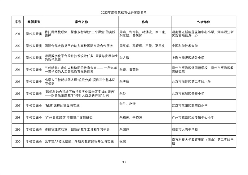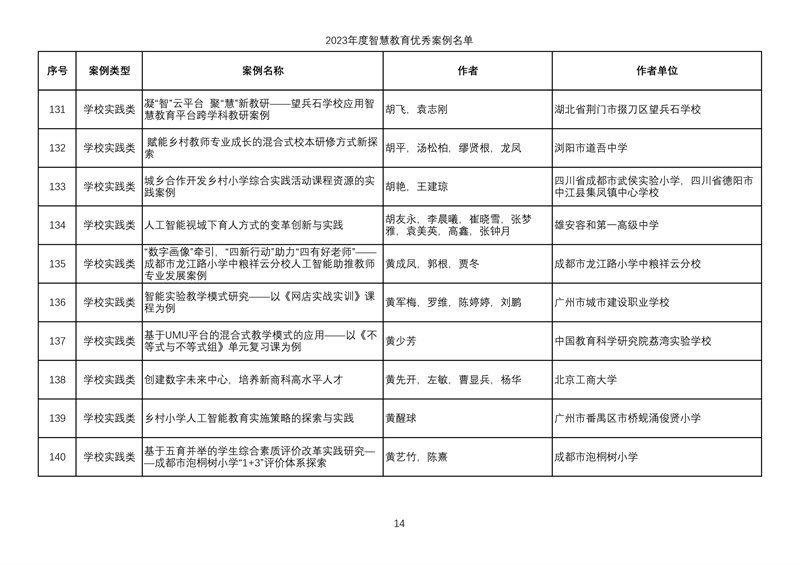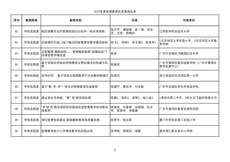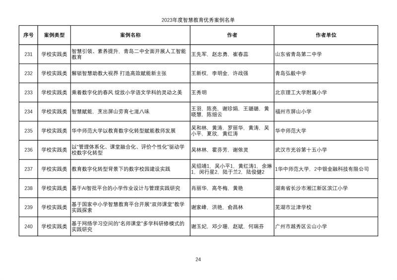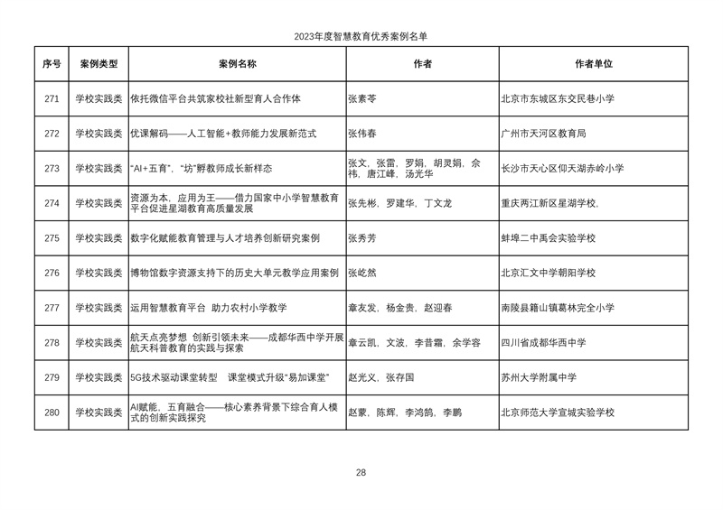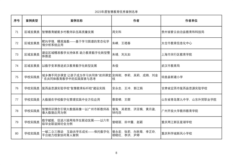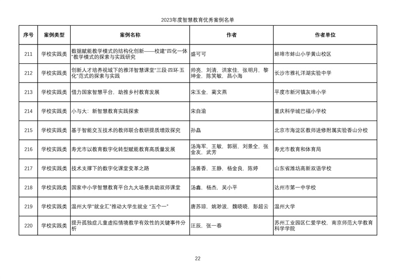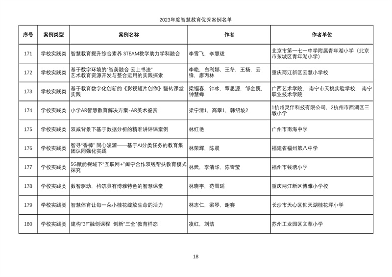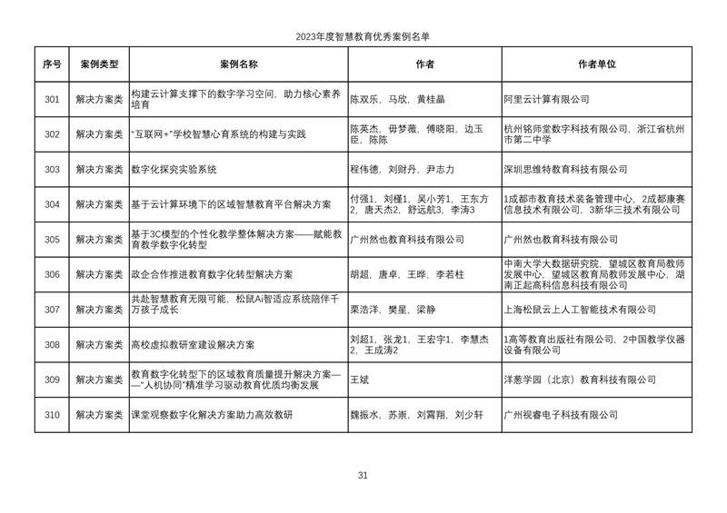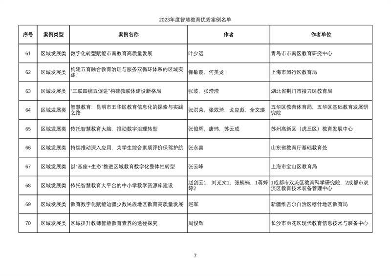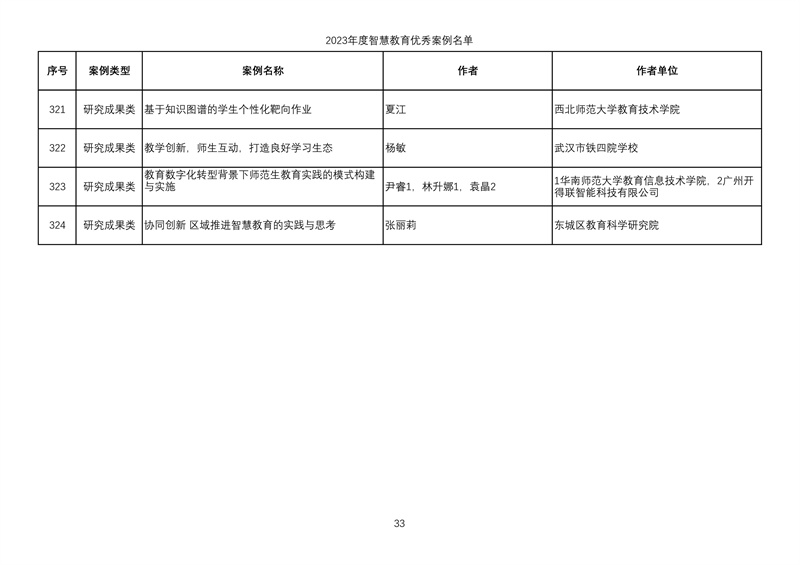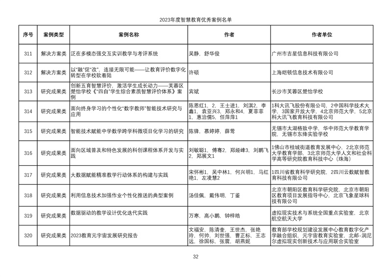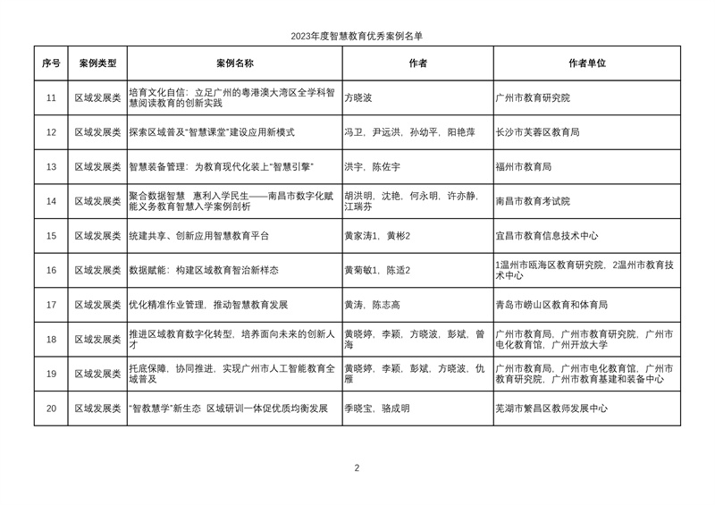 经过申报或推荐、案例撰写培训和修改、专家遴选、公示等环节,共确定324个智慧教育优秀案例,其中区域发展类74个、学校实践类226个、解决方案类12个、研究成果类12个。现将名单予以公布。