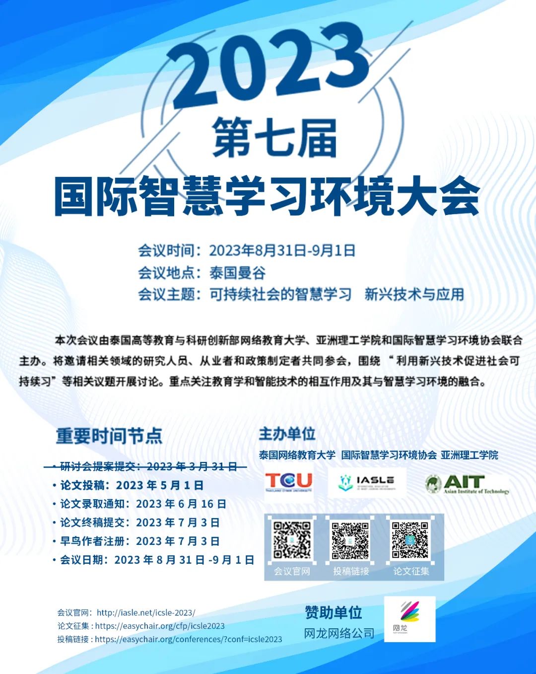 本次会议将由国际智慧学习环境协会、泰国高等教育科研与创新部泰国网络大学和亚洲理工学院联合主办,与2023泰国网络教育大学国际在线学习大会(IEC 2023)同期举行。大会将邀请泰国政府代表为会议开幕,采用线下和线上融合的方式召开,预计届时将有300名代表现场参会和700名代表在线参会。