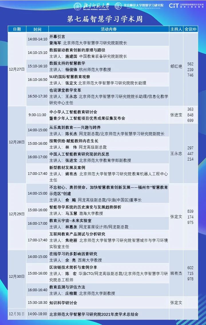 为进一步加强学术交流,促进科技与教育双向赋能,北京师范大学将于2021年12月27-31日举办“第七届智慧学习学术周”,邀请业界人士和高校师生,共同探讨智慧教育、教育设计和未来学习空间等前沿理论和实践。学术周将采用线上线下相结合的形式举办,包括各个主题研讨会、学术讲座等活动,对象包括高校师生、科研机构人员、中小学教师、教育科技企业代表等。