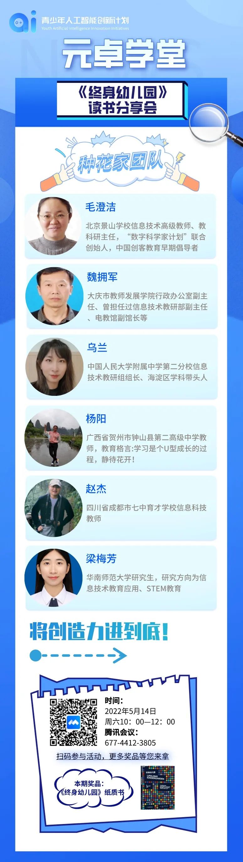 元卓学堂在本月举办“五月读书月”活动,通过读书活动,为社区老师提供互相学习、互相交流的平台。首期围绕义务教育信息科技课程标准开展的学习交流活动已于5月8日圆满结束,本周六(5月14日)元卓学堂——“五月读书月”将迎来第二期活动。毛澄洁老师、魏拥军老师、乌兰老师、杨阳老师、赵杰老师与梁梅芳老师将共同为我们带来《终身幼儿园》读书分享会。