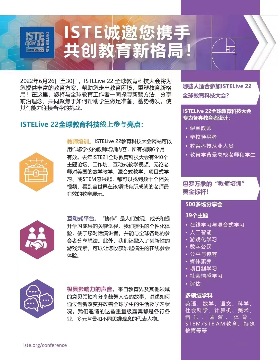 ISTELive 22全球教育科技大会将于2022年6月26日至30日举办,会议将为您提供丰富的教育方案,帮助您走出教育困境,重塑教育新格局!在这里,您将与全球教育工作者一同探寻新颖方法,分享前沿理念,共同聚焦于如何帮助学生做足准备、蓄势待发,使其有能力迎接当今的挑战。