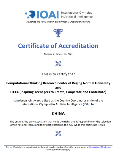 以人工智能为代表的新兴技术飞速发展,对经济行为、产业形态、社会结构、道德伦理、日常生活等方面都产生了深远的影响,正推动人类社会发生整体性巨变。2024年,北京师范大学计算思维教育研究中心将面向中国青少年推出一项人工智能主题国际学术活动——IOAI国际人工智能奥林匹克学术活动(International Olympiad in Artificial Intelligence)。