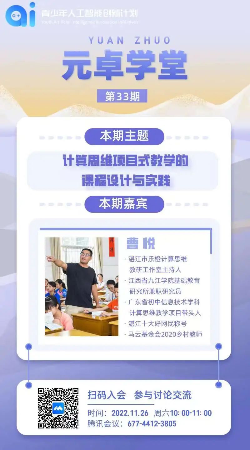 本周六(11月26日),元卓学堂邀请廉江市青平中学曹悦老师,围绕《计算思维项目式教学的课程设计与实践》分享自己的经验与思考,期待各位老师参与讨论交流。